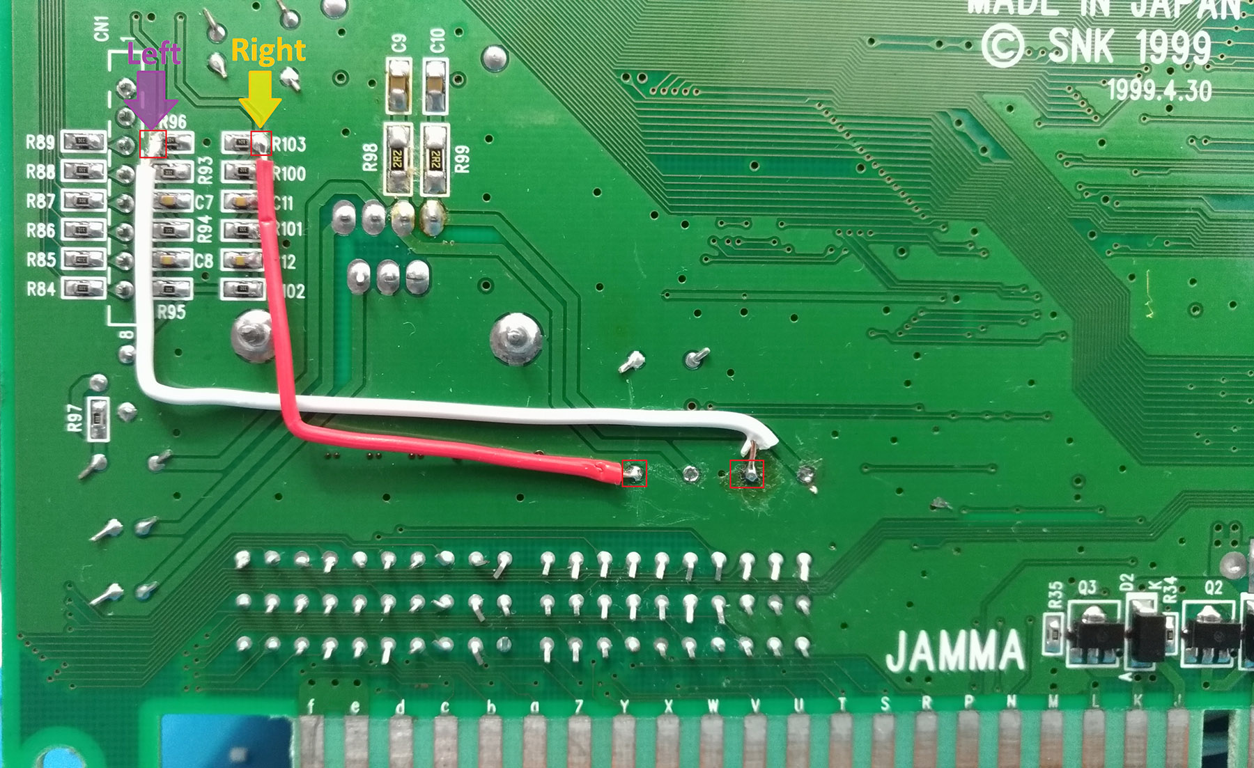 2. Solde um fio nos resistores R96 e R103 até os pontos indicados